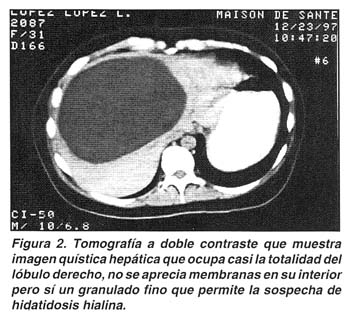 La ultrasonografía o ecografía hepática nos muestra una imagen hiporrefringente con o sin estructuras en su interior, rodeada por una zona de parénquima hepático hiperrefringente. De valor apreciable para el control preoperatorio durante el tratamiento médico y en el postoperatorio para la evaluación de la cavidad residual (figura 1) (6).