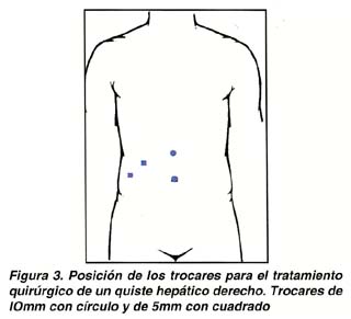 De acuerdo a la localización del quiste hepático los siguientes trocares y portadas serán colocados hacia el hipocondrio derecho o izquierdo. Se requieren por lo menos tres trocares adicionales, uno de 10 epigástrico para el aspirador de 10 mm, dos de 5 mmpara instrumentos de tracción, disección o corte (figura 3).