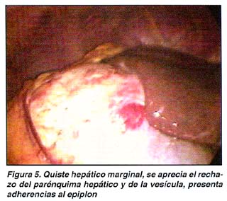 En otras ocasiones los quistes se presentan marginalmente al parénquima hepático y en su desarrollo van rechazando los tejidos adyacentes, ganando espacio hacia la cavidad abdominal (figura 5).