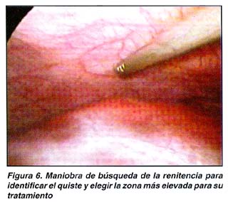 Cuando los quistes no se aprecian adecuadamente bajo la visión laparoscópica, recurrimos a la maniobra de palpación con un instrumento romo en busca de renitencia y cambios en la respuesta a la presión del instrumento sobre el tejido hepático (figura 6).