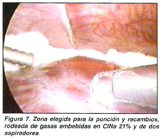 El siguiente paso requiere bastante cuidado y coordinación en el equipo quirúrgico ya que se realiza la punción del quiste en la zona elegida con un trocar laparoscópico 16F ó 18F, conectado a un sistema cerrado en T que permita la aspiración e inyección alternadas. Se mantienen en todo momento la visión sobre el punzón o trocar y los dos aspiradores de 5 y l0mm adyacentes a este. La primera muestra del aspirado del liquido hidatídico es enviada a laboratorio para la búsqueda en fresco de escólex que nos confirmen el diagnóstico presuntivo (figura 7).