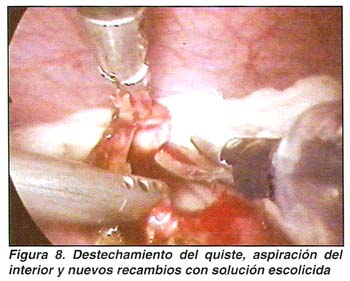 A continuación se puede realizar un mayor destechamiento del quiste, tomando una sección que será enviada a anatomía patológica para su informe, se introduce el aspirador delgado para la succión del contenido y nuevos recambios con solución escolicida (figura 8).