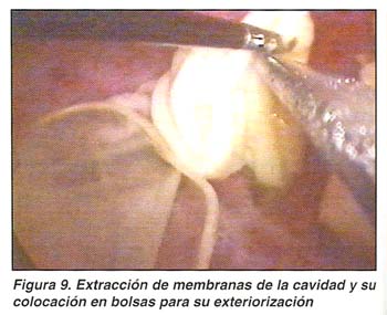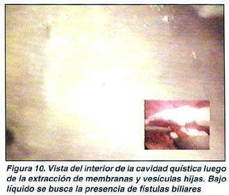 Si el quiste contiene membranas y vesículas hijas se puede tratar de punzar éstas e inyectarles solución escolicida para luego extraerlas fuera de la cavidad hepática a introducirlas enbolsas para extracción de piezas, introducidas previamente. Nuevamente, debe aspirarse todo líquido o residuo fuera de la cavidad quística. Este paso requiere cuidados extremos y coordinación del equipo quirúrgico (figura 9).