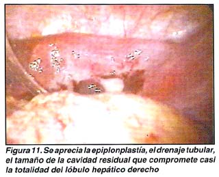Finalmente se realiza la omentoplastía, tomando un borde del omento mayor e introduciéndolo al interior de la cavidad quística y sujetándolo con suturas reabsorbibles a sus bordes. Adicionalmente puede colocarse un drenaje tubular multifenestrado 16F que se exterioriza por una de las portadas laterales (figura 11).